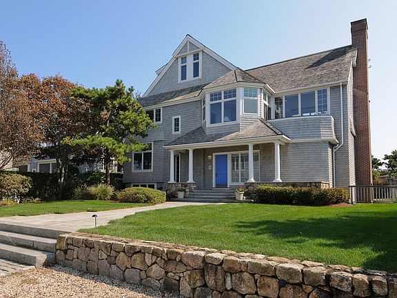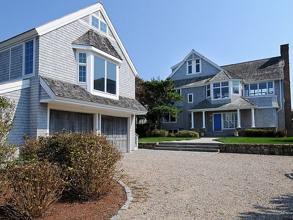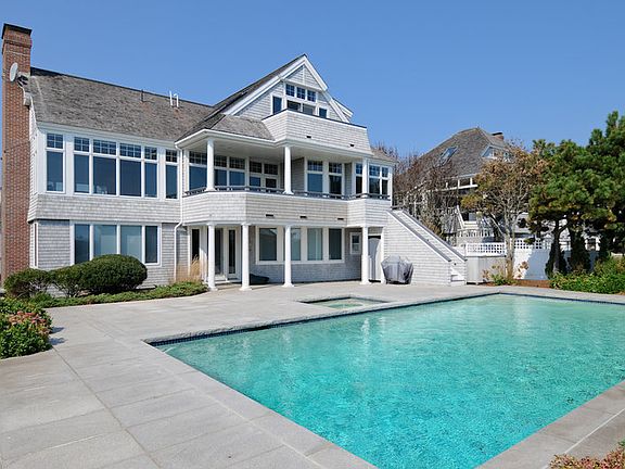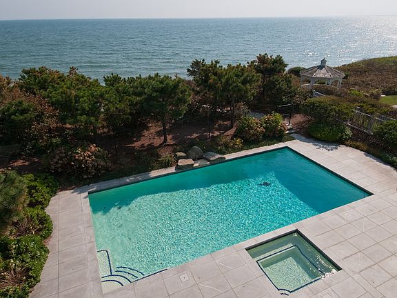 Located in Seaside in New Seabury, this five bedroom shingle style home with over 5200 sq. ft. of living offers dramatic ocean front with golf course views, stairs leading to a sandy beach and an oversized garage with a guest suite above. Linger by the 20 x 40 pool with granite decking and spa, or stroll down the stairway to a long stretch of sandy beach. This stunning home is the perfect spot to enjoy all the amenities of seaside resort living. The private master suite with oceanside balcony on the upper level offers a secluded retreat. The main living area includes light filled living/dining rooms, den, and sleek, efficient kitchen - all capturing views of the Sound. The entry level provides for two bedroom suites and office. Lower level complete with guest suite and family/media room.