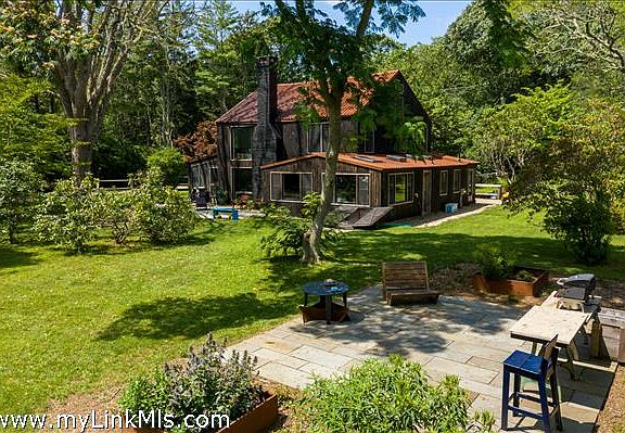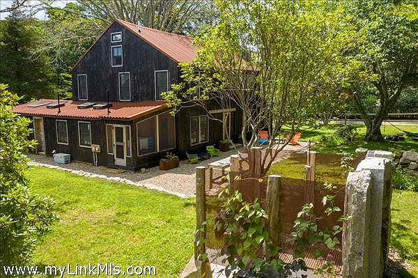 Nestled on South Road in Chilmark is this eclectic, rustic yet newly renovated house and guest house ....Formerly known as "The Fenner Barn" the original home was once a two story barn dating from 1900. The current owners embarked on a renovation which would keep the authentic feel of this original barn, but bring a modern utilitarian vibe to the traditional New England antique building. A metal seam roof was added, large windows, industrial lighting and concrete counters were stylishly combined with natural materials such as the beautifully refinished original floors, whitewashed wood, exposed beams and stone walls. The comfy, casual main family home has a large primary bedroom and bath on the first floor as well as an open kitchen/breakfast room, dining, living area with beautiful hardwood floors, and exposed beams with a large fireplace centering the space. Two newly added large square double height windows that look out to the yard help to bring nature into this home. There are two additional screened in porches off of which help to give this home a great indoor/outdoor flow. Upstairs to the second floor great room , new oversized windows help to create great light. This room has exposed white-washed beams and trusses, two bedrooms and a bath and den/office in the loft above. Floor mounted AC mini splits provide the heating and cooling and there are new appliances throughout. The exterior of the home has been treated with a Japanese style process called Shou Sugi Ban. This technique will maximize the longevity of the rough milled pine and gives it a bold contrast to the red metal roof. The sprawling outdoor space with quintessential Chilmark stone walls, a great patio with fire pit and play area, plus an amazing stand alone outdoor shower constructed of stone, wood and metal. The property has an impressive assortment of established trees and lawn area that separates the main home from the sweet one bed guest cottage with full bath and second outdoor shower. Beyond this is the basketball court, storage sheds and paths that connect through to hiking trails to the south shore and and other ancient ways.