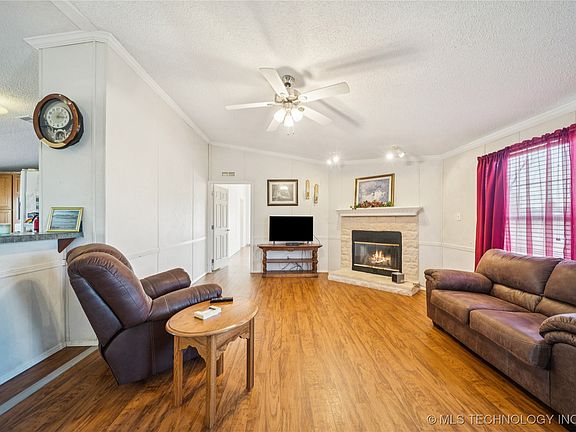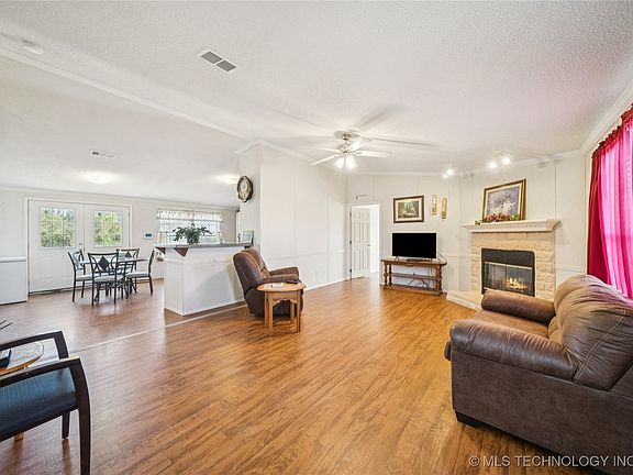 This well-maintained 2003 Southern Energy double-wide offers 1,680 sq ft of comfortable living space on a half-acre just west of Pryor, giving you quick access to town without losing the quiet, open feel of the country. The home welcomes you into a large living room and an electric corner fireplace that adds a warm touch without the hassle of wood. The layout is open to the dining area and kitchen, where you’ll find plenty of cabinets, generous counter space, a kitchen island, and French doors leading out to the back deck with both stair and ramp access. The split floor plan gives everyone breathing room. The primary suite sits on one side of the home and includes a big walk-in closet, double vanities, a whirlpool tub, and a separate shower with dual bench seats. Off the main bedroom is an additional room that works perfectly as a nursery, office, or private retreat, complete with built-ins. On the opposite end of the home are two nicely sized bedrooms with standard closets and a full guest bathroom. The laundry area—conveniently located off the dining space—also doubles as a pantry for extra storage.
