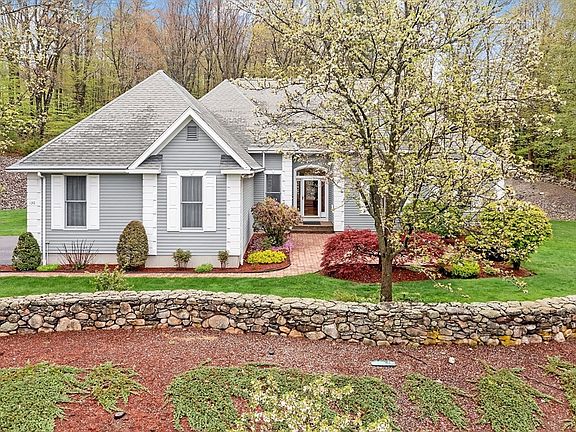 Thoughtfully designed and meticulously maintained accessible executive ranch set on 4 acres! Enjoy single level living full of desirable features! Three bedrooms and 2.5 baths on the main level, including an XL main suite bathroom with zero-clearance tile shower and jetted tub. Feature-packed kitchen with warm tone cabinets, tons of storage space and recent stove/ovens. Open living/dining room and family room with gas fireplace. 9'+ ceilings and oversized windows with custom blinds throughout. The sun room is a houseplant’s dream come true! New natural gas heating system, garage doors and openers in 2022. Whole-house generator, central AC, vacuum and irrigation systems and security alarm. Deck to flat back yard and mature landscaping. Bonus—with the new ADU law in MA, buyers might look at the potential to convert the finished basement area (already has a full bath) into an inlaw apartment or maximize the 4 acres to construct a detached accessory dwelling unit for multigenerational use.