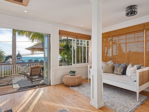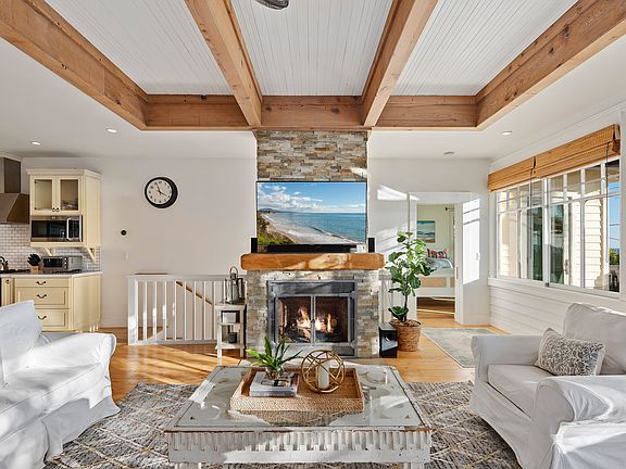 The three bedroom and three and a half bath home boasts and open floor plan living space complete with detailed craftsmanship including rustic wood beams, hickory floors, entry nook, restored original windows, a stone covered fireplace, and shiplap wall with the deck and ocean views as the premier feature. The ample outdoor living space includes a large deck, outdoor dining table, Traeger grill, separate fire pit and in-ground jacuzzi. The primary bedroom is located on the main level with an ensuite bath. Downstairs features a media room, a bedroom with two twin-sized built in bunk beds, and a bedroom with a queen sized bed. Both bedrooms downstairs have ensuite baths and ocean views.