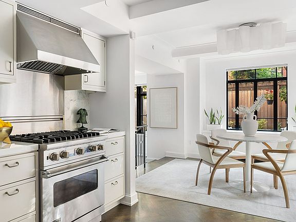 The sunken living room is generous in scale and grounded in calm. It opens directly onto the garden-lush, quiet, and almost improbably removed for a building in the center of downtown Manhattan. The flow is intentional. A windowed dining area connects to a west-facing kitchen with Nanz hardware, Viking appliances, and materials that are built to last.