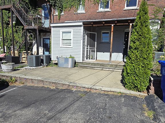 Additional amenities include in-unit laundry with a high-end Miele W1 washer, central air conditioning, and a deeded parking spot. The building's classic brick exterior and recessed green door entry add curb appeal and character.