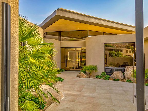 An iconic Guy Dreier design completely transformed by Easton Builders with interiors by Fedderly & Associates. Located in the prestigious Bighorn Golf Club, one of the desert's most exclusive private clubs, this 5,400 sq ft home offers 4 bedrooms, 6 bathrooms, and commanding views of the 9th fairway, picturesque mountain ranges, and city lights from Bighorn's Mountains Course. The primary suite features a private office with courtyard views, luxurious master bath, and newly remodeled steam bath capturing breathtaking vistas. Two interior guest suites occupy the opposite wing, plus a separate-entrance guest house for ultimate privacy. Soaring ceilings, floor-to-ceiling glass, and seamless indoor-outdoor flow create stunning living spaces throughout. Multiple outdoor entertaining areas include a pool and spa, built-in BBQ, reimagined river water feature, and firepit perfect for sunset gatherings. Essentially a brand-new home with stunning cosmetic upgrades, it also features a new roof, completely new plumbing, electrical, HVAC systems, pool equipment. Offered fully furnished and move-in ready.