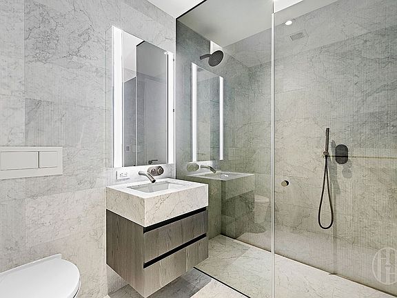The equally lavish bathroom offers a place of sanctuary to unwind from a busy day, with Italian marble and radiant heated floors.