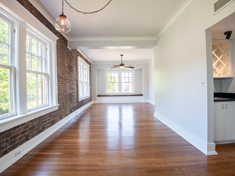 Refinished hardwood floorsSpacious screened porchPocket doorSoaring ceilingsLight-filled roomsExposed brick