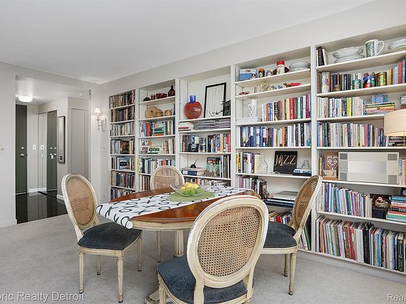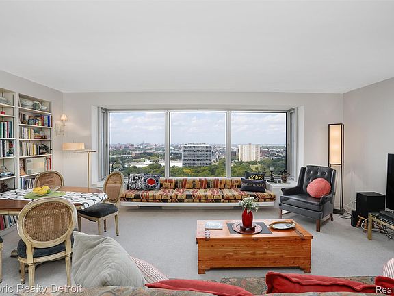 Detroit’s iconic 1300 Lafayette East Cooperative, is one of the city’s most celebrated examples of International Style modernism. Residence #2211 is a rarely available combined floor plan, merging a one-bedroom and studio into a spacious 2-bedroom, 2-bath home. Thoughtfully redesigned with custom high-end finishes, the residence pairs mid-century sophistication with modern comfort. The open living and dining areas are defined by expansive, near floor-to-ceiling picture windows that frame sweeping views of Detroit’s skyline and the green expanse of Lafayette Park. A full wall of custom built-in bookcases adds both function and character, creating the perfect showcase for books, art, and personal collections while reinforcing the home’s sense of scale and design. The chef-inspired kitchen features quartz countertops, sleek cabinetry with integrated storage, and a GE Profile stainless steel suite including a European-size, multi-compartment refrigerator designed to maximize space, an induction cooktop, convection wall oven, and microwave with built-in venting and sensor cooking technology. The primary suite offers generous proportions with ample storage, walk-in closet/dressing room, while each bath is finished with the original clean, modern lines. The studio wing sets this home apart—an adaptable space ideal for a live/work setup, art or music studio, or even separate sleeping quarters for couples seeking privacy and flexibility. Residents enjoy a full-service lifestyle with 24-hour staffed entry and concierge, two outdoor heated pools, a fitness center, tennis courts, renovated community rooms, and secure indoor parking. The monthly HOA includes property taxes, heat, A/C, water, maintenance, and reserves, with a portion tax-deductible. In the center of it all, Downtown Detroit, the Riverwalk, Eastern Market, Dequindre Cut, and major highways, this home offers unmatched access to parks, cycling and walking trails, shopping, groceries, and the city’s cultural hubs.