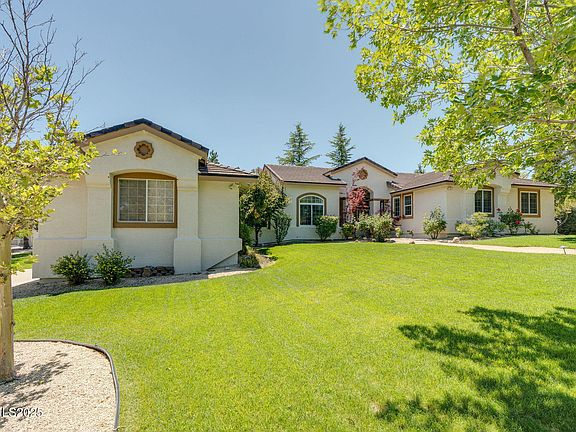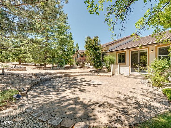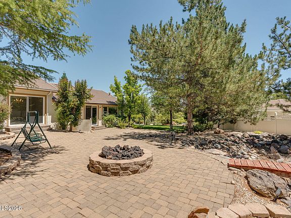 Discover the potential in this spacious home located in the highly sought-after community of South Reno with NO HOA! With a park like vibe, this property features multiple living and entertaining spaces inside and out! To the left of the home, you'll find a den with private entry access and an open-concept kitchen and family room that serves as the heart of the home. Right off the family room is a half bath & a mudroom that leads right into the 4-car garage with built-in shelving and dedicated work area. On the right of the home, you'll step up into the hall, leading you to the bedrooms and the primary suite which offers a cozy fireplace, walk-in closet, dual sinks, separate vanity and an independent shower, creating a relaxing private retreat. The backyard offers a peaceful private trail winding through mature trees, beautifully paved patio spaces for entertaining, and an inviting stone fire pit, perfect for gathering with friends or unwinding with your family.
