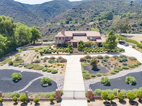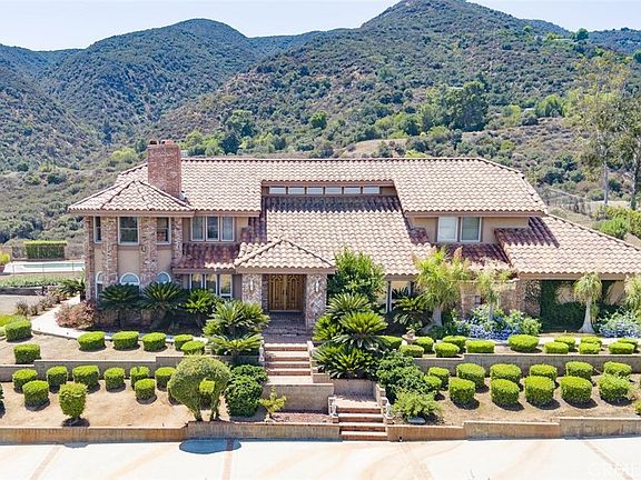 Welcome home to this 5-acre estate located on the exclusive hillside of South Corona adjacent to the expansive beauty of the Cleveland National Forest. This 5,000 sft Spanish influenced home is has a sweeping views of natural hills and city lights. Terracotta brick flooring to the hardwood French sliding doors and vaulted pinewood ceilings. Double door entry into the spacious foyer, with stark white arched doorways and contrasting hardwood trim. This home is ideal for entertaining both sizable events and intimate family gatherings. The family room has a dual fireplace that is shared with a cozy sitting room with views of the city below. The kitchen flows into the game room with walk-behind wet bar and vaulted paneled ceilings. The