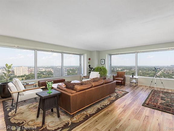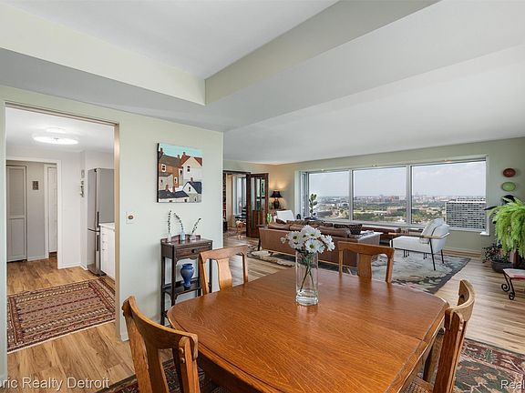 1300 E. Lafayette #2407 — Elevated City Living with Iconic Views. Perched high on the 24th floor of Detroit’s iconic 1300 East Lafayette Cooperative, this 1,664 sqft corner residence embodies the best of modern city living. Recently reimagined with a designer-renovated kitchen and full laundry room, the home blends timeless architecture with the vibrant energy of downtown. Step inside to sweeping, panoramic views of the Detroit River, city skyline and beyond—a dramatic backdrop that shifts with the seasons, festivals, and the city lights at night. Floor-to-ceiling windows flood the open living and dining spaces with natural light, creating a gallery-like atmosphere for entertaining, art, and relaxation. Thoughtful upgrades include California Closets with an integrated Murphy bed, custom mirrors that amplify the skyline, and full in-unit laundry for convenience. Every detail has been considered for elevated, flexible living. Life at 1300 East Lafayette means more than just a home—it’s a lifestyle: 24-hour concierge and secure indoor parking for peace of mind. Two heated outdoor pools, renovated tennis courts, and a fully equipped fitness center to support wellness and leisure. Event spaces and resident activities that connect you to Detroit’s creative, professional, and cultural community. The monthly HOA is comprehensive—covering property taxes, water, heat, A/C, building maintenance, and on-site management—with a portion tax-deductible for added value. Located minutes from the RiverWalk, Dequindre Cut, Eastern Market, and Detroit’s Cultural Center, you’ll find yourself at the crossroads of art, food, music, and movement. With direct access to major expressways, Lafayette Park offers an unmatched blend of convenience and community, where mid-century modern design meets a thriving downtown lifestyle. This is more than a residence—it’s a front-row seat to Detroit’s resurgence.