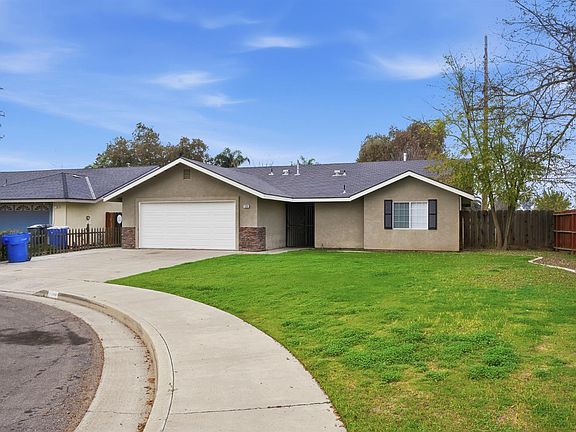 Welcome to this clean and move in ready single story home tucked away on a quiet cul de sac in Hanford. Featuring a bright and open layout, the home offers fresh white interior paint, a spacious living area with ceiling fan, and a functional kitchen highlighted by granite countertops, white cabinetry, and a breakfast bar ideal for everyday living. Tile flooring flows through the main areas and bedrooms for easy maintenance, while multiple ceiling fans throughout enhance year round comfort. The bedrooms are well sized with ample natural light, and the updated bathroom includes a granite vanity and a tub/shower combo. Step outside to a generous backyard with lush lawn space, a covered patio perfect for entertaining, and a built in fire pit area for gatherings. The exterior is complemented by a wide driveway, two car garage, and low maintenance landscaping. Conveniently located near schools, shopping, and local amenities, this home offers a great combination of comfort, functionality, and outdoor space in an established neighborhood.