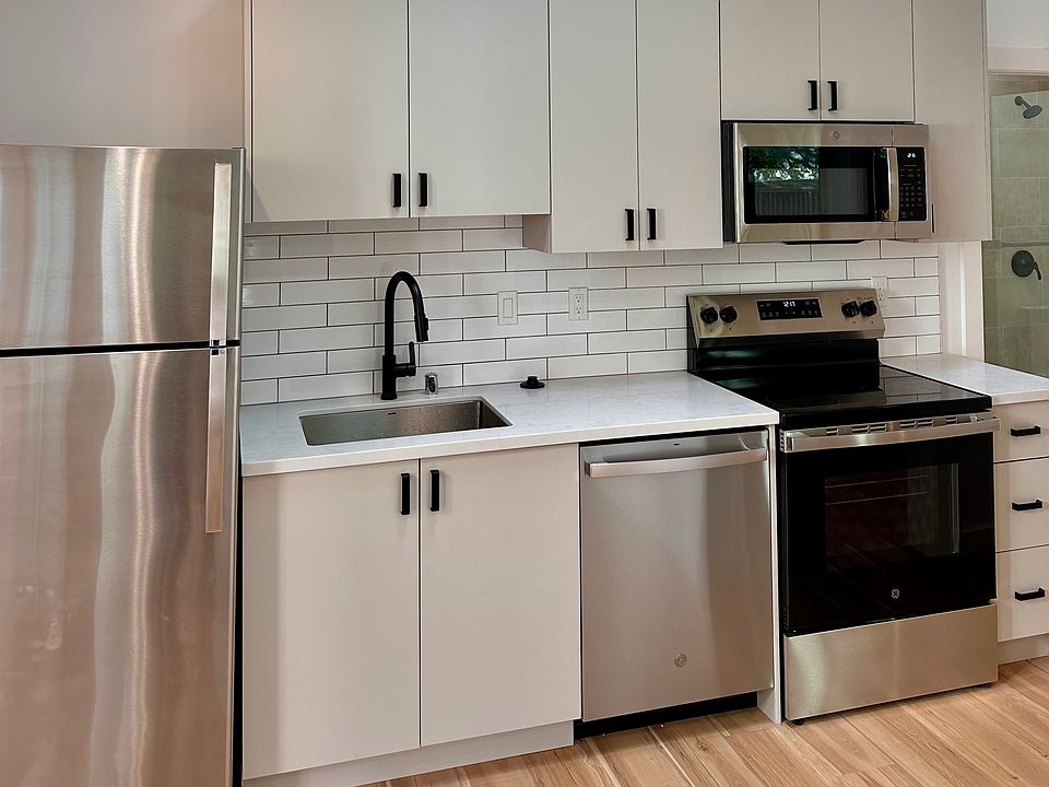 - Brand new stainless steel appliances including dishwasher and InSinkErator garbage disposal
