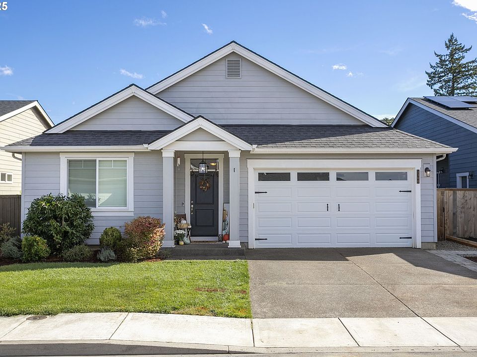 Built in 2020, this beautifully maintained single-level ranch offers 3 bedrooms, 2 baths, and 1,853 sq. ft. of thoughtfully designed living space including a comfortable den, perfect for a home office, play room, or nursery. The open great room features a cozy electric fireplace, high ceilings, and large windows that bring in natural light, creating a warm and inviting atmosphere.The kitchen is a standout with quartz countertops, a generous island, stainless steel appliances, and a walk-in pantry—perfect for both everyday living and entertaining. The primary suite includes a spacious walk-in closet and a spa-inspired bath with dual sinks and a walk-in shower.Outside, you’ll find updated landscaping around the entire perimeter, raised garden beds with fresh vegetables, and a covered patio ideal for year-round enjoyment. The property has been lovingly cared for inside and out, reflecting pride of ownership at every turn. A two-car garage provides added convenience and storage.Set in a well-kept neighborhood close to schools, shops, parks, and outdoor recreation, this home offers the perfect balance of small-town charm with easy access to the Portland metro. Call today to schedule your private tour!