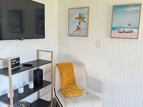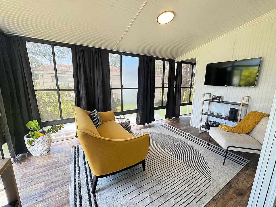 Inside, vaulted ceilings, large windows, and warm wooden paneling create a bright, airy atmosphere. The open floor plan is bathed in natural light, with light shiplap walls enhancing the fresh, coastal feel. The living area features stylish furnishings, a TV, and ample shelving.