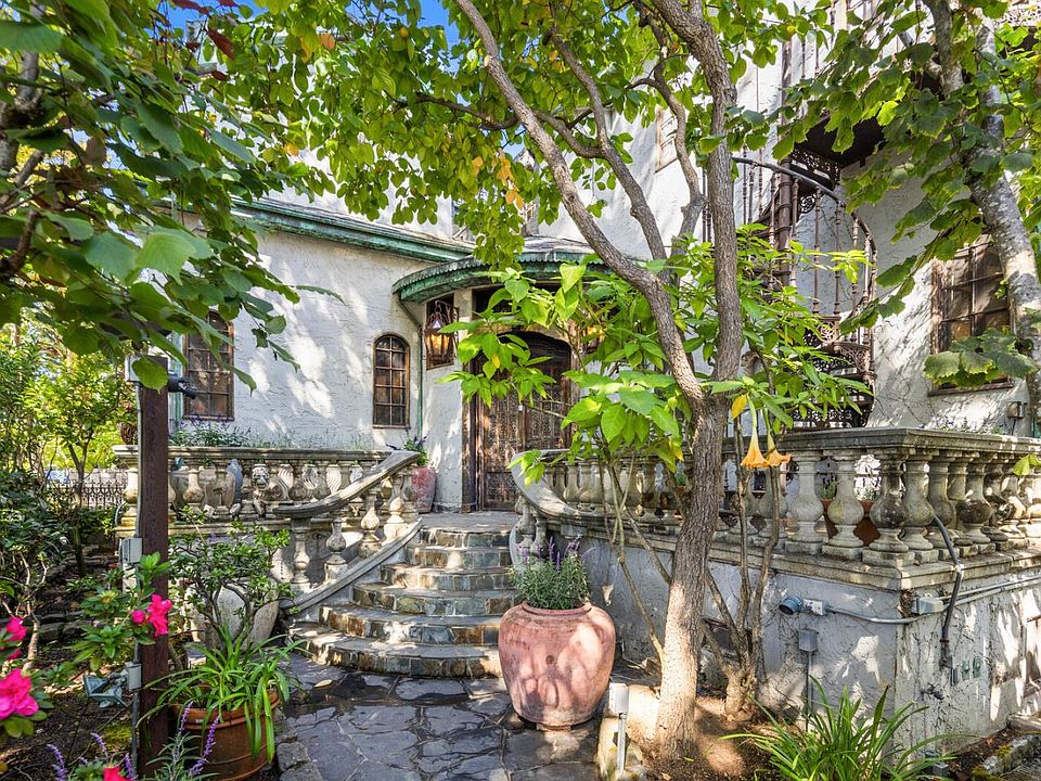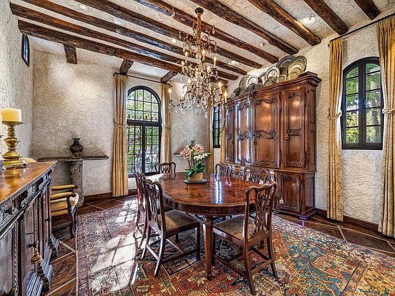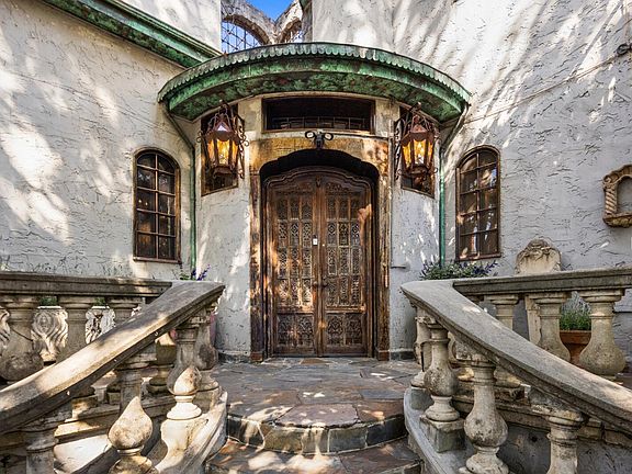 Celebrated for its architectural significance, this extraordinary home was featured in Architectural Digest in 1992. The home was rebuilt during the late 1980s into an Old World European country house. Its turreted foyer, hand -plastered walls, arched windows, and rustic beams evoke the romance of Southern France and Italy. Featuring soaring living room with a limestone fireplace, formal dining room and an old fashioned kitchen with hand-hewn cabinetry, concrete counters and leaded-glass windows. The top floor is devoted to a spacious primary suite with fireplace, private balcony and luxurious bath. Adjacent to the bedroom is a family/media room beneath a lofty ceiling which could be used as a bedroom. The 2nd level offers a library adaptable as a third bedroom, an additional bedroom and a large bath. The lower level adds a bonus room with outside entrance and an adjoining bath.