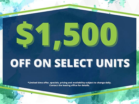 - Special offer! $1,500 off on select units! *Restrictions apply. Specials, pricing, and availability subject to change daily. Contact the leasing office for details.