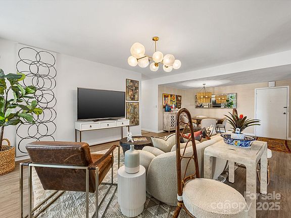 Bright and spacious 2-bedroom home at The Kimberlee – Myers Park’s iconic Art Deco Co-Op! Discover elevated living inside this rare, oversized home (1,656 sqft), steps from Park Road Shopping Center, Freedom Park, and Charlotte’s scenic Greenway walking path. Originally three bedrooms, unit #200 has been thoughtfully reimagined as a luxurious two-bedroom oasis. Bathed in natural light, featuring a flowing, open-concept great room that offers a bright, airy atmosphere and serene, tree-lined views. Enjoy morning coffee or evening sunsets from two private balconies. The primary suite, wrapped in high-end wallpaper, is tucked away at the far end for maximum privacy and comfort, complete with a generous walk-in closet that offers potential for a second full bath. The guest room features a built-in murphy bed, seamlessly blending style and function. Designer updates include new appliances, fresh paint, and high-end lighting fixtures, elevating every corner of the home. The Kimberlee offers resort-style amenities, including deeded parking, private storage locker, a Sky Lounge with full kitchen, pool, community garden, new fitness room, guest suite, and a private owner's bridge to Park Road Shopping. The HOA fee covers property taxes, building and grounds maintenance, water, sewer, cable, and Wi-Fi. This is a rare opportunity to own a spacious, designer-renovated co-op with abundant light, serene views, and timeless luxury in one of Charlotte’s most coveted neighborhoods.