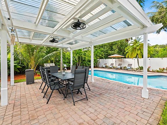 Minimum 1 month short-term rental. This fully remodeled 3 bedroom, 2 bathroom corner-lot home in River Oaks sits on a private, lush street and features a heated pool surrounded by tropical landscaping. Offering nearly 2,000 square feet of living space, the property boasts a formal dining room, breakfast nook, modern bathrooms, and a kitchen with quartz countertops, stainless steel appliances and gas stove. Tile flooring throughout, impact windows and doors, extra storage and a wraparound driveway add convenience. The fenced backyard showcases a spacious pool deck with covered pergola and grill, ideal for entertainment. Fully furnished, stocked and move-in ready, the home sleeps eight comfortably. Located just minutes from the FLL international airport, downtown and beaches.