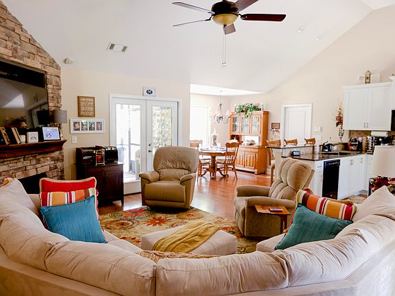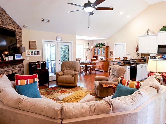 The main living area is enhanced by a charming stone gas log fireplace, offering warmth and comfort during cozy evenings. The cathedral ceiling adds a touch of grandeur to this gathering space.