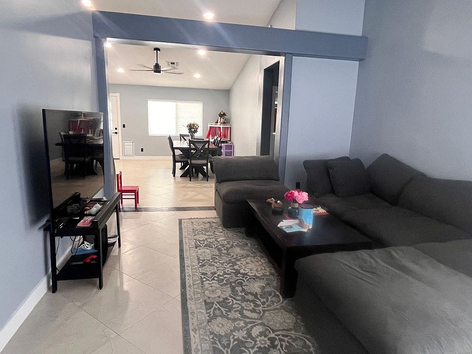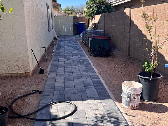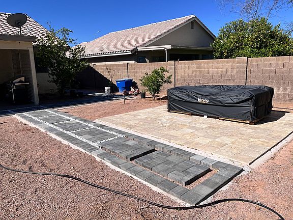 - Newly installed 14x14 travertine pavers in the backyard for your outdoor set
