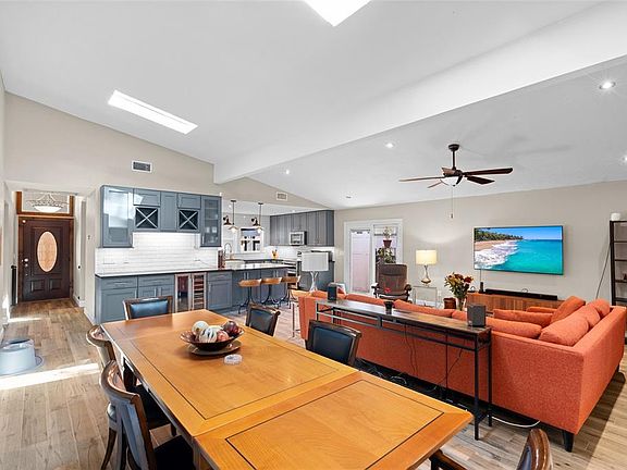 Quartz countertopsSubway tileTranquil pool oasisCustom slate blue cabinetryLots of privacyDouble deep lotApron sink