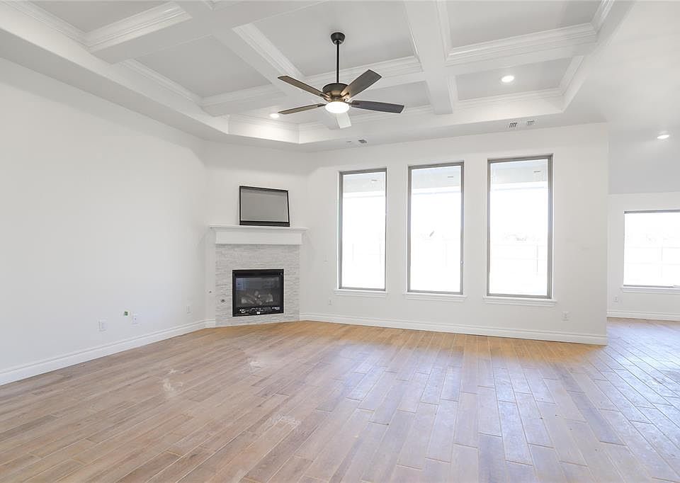 The Hazel floor plan has a total of 2,095 Sqft for living space, including 1,900 Sqft of indoor living and 220 Sqft of outdoor living that features a wood-burning fireplace, a gas line, and a TV hookup! This immaculate home offers 4 bedrooms, 2 full bathrooms, covered patios, a utility room, and a 3-car garage with an in-ground storm shelter installed. The great room presents a beautiful coffered ceiling with a ceiling fan, a gorgeous corner gas fireplace with our stacked stone detail, large 7’ windows, rocker switches throughout, and elegant wood-look tile. The high-end kitchen has stainless-steel appliances, including a 5-burner cooktop, decorative tile backsplash, custom-built cabinets to the ceiling with under cabinet lighting and cabinet hardware installed throughout, a large corner pantry, 3 CM countertops, more wood look tile, stunning pendant lighting, and an oversized center island that holds a farm sink, a dishwasher, and a trash can pullout. The primary suite spotlights a sloped ceiling detail with a ceiling fan, windows, and our cozy carpet finish. The spa-like prime bath has a free-standing tub, a dual sink vanity with framed mirrors, 3 CM countertops, a European walk-in shower, a private water closet, and a huge walk-in closet with horizontal and vertical storage opportunities. Secondary bedrooms feature high ceilings with ceiling fans, sizeable closets, windows, and carpeted flooring. Other amenities for this energy efficient home include a tankless water heater, a fresh air ventilation system, R-44 and R-15 insulation, and so much MORE!