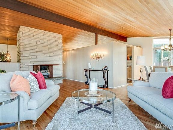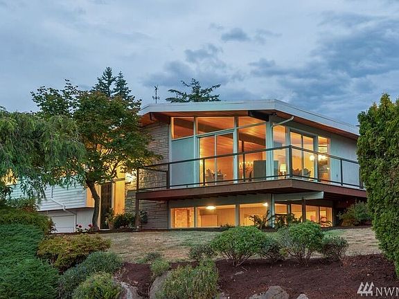 Water and Mountain View home, privately situated on a quiet corner lot in the Broadview neighborhood in NW Seattle. Spacious, open, & light-filled LR, DR, and Kichen, w/clear cedar vaulted ceilings, hardwood floors, picture windows, 3 BRs, including MBR, on the level entry main floor, with sliding doors leading to spacious view deck, to private backyard with gardens, MBR tiled patio, arbor covered large deck, and surrounding trellised fence, The finished lower level has a spacious family room w/ 2nd fireplace, bonus room, and large utility room. Oversized garage w/ shop space. Ample storage throughout.