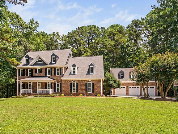 Massive brick home featuring 4 bedrooms, 5.5 bathrooms, a two-car attached garage, a three-car detached garage, and a basement garage. Just a short walk to Falls Lake, the property is surrounded by mature trees and nature. A charming front porch overlooks the grassy front yard, while a new front door and updated exterior lighting provide a warm welcome. Inside, nearly every floor has been upgraded to LVP, except for the lofts on the fourth floor and the laundry rooms. Oak stair treads with wrought iron balusters add an elegant touch to the entryway. To the left is a home office; to the right, a formal dining room. The updated kitchen showcases quartz countertops, a subway tile backsplash, refinished cabinetry, stainless steel appliances, updated lighting, and new hardware. The living room features a wood-burning fireplace with a propane connection for convenience. A vaulted-ceiling sunroom, with three new windows and new exterior doors to the deck, offers the perfect retreat or second dining area. The back deck overlooks a partially grassy backyard bordered by woods for added privacy. The spacious main-floor bedroom includes a fully updated bathroom with dual vanities and a luxurious tub surrounded by tile to the ceiling. Upstairs, the second floor boasts a huge bonus room with built-in bookshelves and cabinets. The private master suite features crown molding, a new ceiling fan, a walk-in closet, and a luxurious bathroom with vaulted ceilings, a brand-new 96'' dual vanity, and a spa-like shower. Two additional bedrooms share an updated bathroom, and a large laundry room with ample storage completes this level. The third-floor ''penthouse'' includes two large flex rooms, an open loft, skylights, high ceilings, generous closets, and unique loft spaces. An updated bathroom with dual vanity completes this level. Note: The penthouse and basement bonus areas were finished by a previous owner around 2000 without permits. The finished basement offers a bonus room, flex room, and newly updated full bath, plus an unfinished section with dual doors and a roll-up garage door leading to a carport beneath the deck. A second washer/dryer hookup and abundant storage are also included. The detached garage features three separate doors, a walk-in door, high ceilings, a built-in workbench, and stairs to an unfinished upper floor—perfect for storage or future expansion. Nearly every floor has been replaced, the entire home freshly painted inside and out, most lighting fixtures updated, all bathroom vanities replaced, and every bathroom renovated. All three HVAC units have been replaced within the past 3 years. This move-in-ready home blends timeless charm with modern updates in a serene wooded setting near Raleigh, Wake Forest, and Durham. Please note: The total finished area above grade is 4,406 sq ft, which includes 738 sq ft on the third floor that was finished without permits. The finished below-grade area is 627 sq ft, which was also completed without permits. The permitted finished square footage of the home is 3,668 sq ft, with a total of 5,033 sq ft when including all finished areas. Additionally, there is 1,588 sq ft of unfinished storage space and 1,437 sq ft of garage space. Altogether, this results in 8,058 sq ft of finished and unfinished space under the two roofs. The septic system for this home is permitted for a 4-bedroom home. The home is located 0.9 miles from the Barton's Creek Boat Ramp and 1.9 miles from Blue Jay County Park.