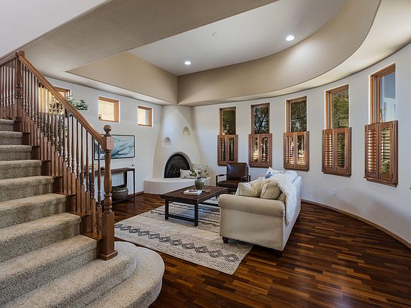 Live near our beautiful Sandia mountains in desirable GATED community of Chelwood Hills. Enter through wood door with speakeasy opening*This custom designed home offers many amenities. Gorgeous wood floors in main living with cozy Kiva fireplace. Lots of windows which make it sunny and bright! Most windows have wood shutters* Large kitchen features tile, granite counters, stainless appliances. Downstairs bedroom has en suite bath. Primary bedroom is upstairs with luxurious bath, huge closet and VIEWS! Laundry room is upstairs for easy convenience. Best of all there is a new TPO roof added 9/25 along with a new hot water heater 7/25. Low maintenance front and back yard for easy care and located at the end of a cul-de-sac.