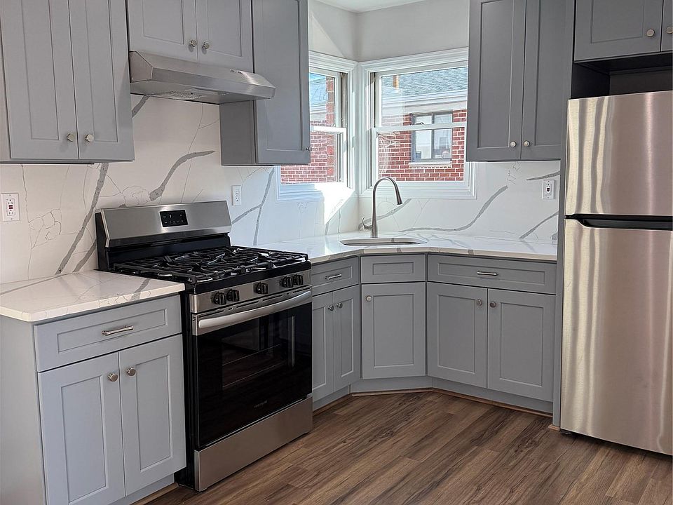 The apartment features a brand-new kitchen with stainless steel appliances, custom cabinetry, quartz-style countertops, and recessed lighting, perfect for both everyday living and entertaining. Multiple windows throughout flood the home with abundant natural light, enhancing the open and airy feel.