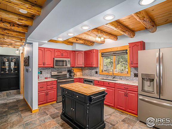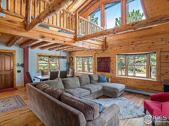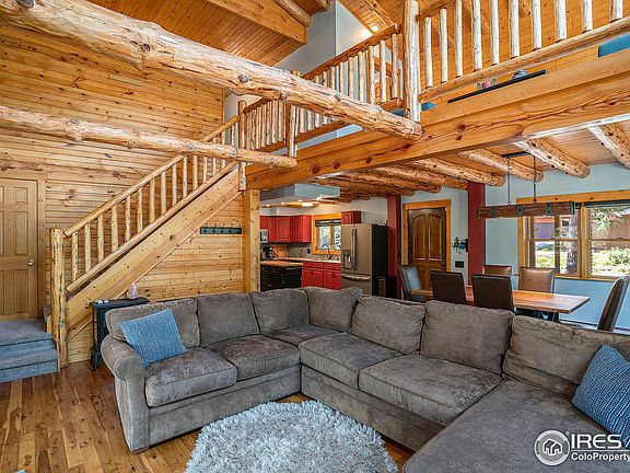 Escape to your sanctuary in the mountains with views of Rocky Mountain National Park from your covered deck. This log-built home has been recently updated with new carpet, remodeled bathrooms, incredible outdoor living with stamped concrete, fire-pit, hot tub, protected dog run with Astroturf and so much more. The open floor plan features vaulted ceilings with exposed beams, gourmet kitchen with granite countertops, main floor primary suite with flex room that would be great for an office, sitting room or exercise room. The loft upstairs is great for relaxing with generous natural light from the expansive windows. The one car heated garage and carport provides all the parking you need. Don't miss the fire pit on a nearly 3/4 acre lot with mature trees. All furniture and furnishings included in the sale.