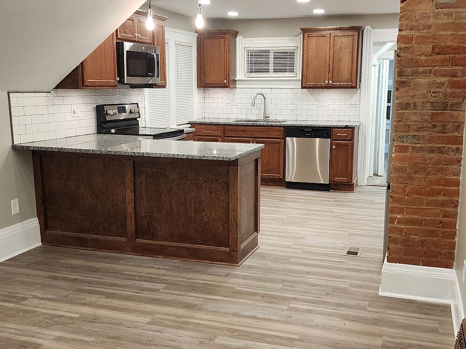 New stainless French door fridge and dishwasher, new GE stainless over-stove microwave, stainless Whirlpool electric stove, disposal, under cabinet lighting