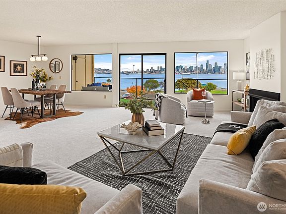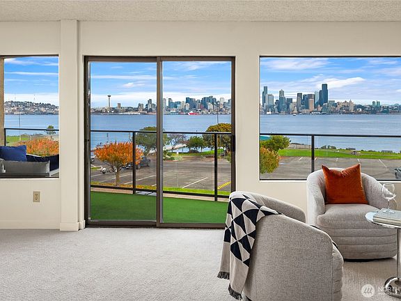 Wireless views of Elliott Bay, the city & mountains abound from this beautiful beach condo! This spacious 2 bed / 1.75 bath unit will not disappoint, featuring a host of updates including new flooring, fresh paint, quartz counters, 1-year old water heater, gas fireplace & more. Enjoy an open concept layout with entertainment sized living & dining spaces, a covered view deck & a thoughtful kitchen with breakfast bar. The bedrooms are generous, with the primary featuring a huge walk-in closet & en-suite bath with double-sinks. Exceptional storage - including 3 storage units - plus 2 dedicated parking spots in a secure garage. Well run HOA & coveted West Seattle location near the Water Taxi, Marination Ma Kai, Alki beach & more. Welcome home!
