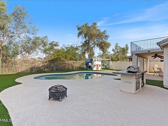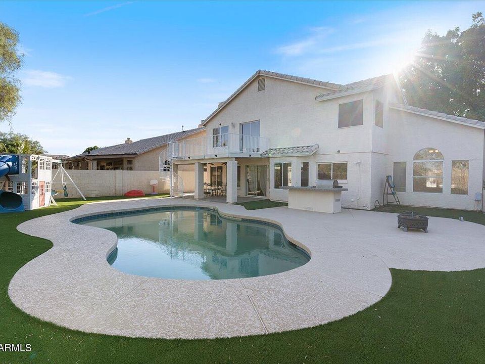 Light-filled primary suitePool and outdoor barBackyard swing set