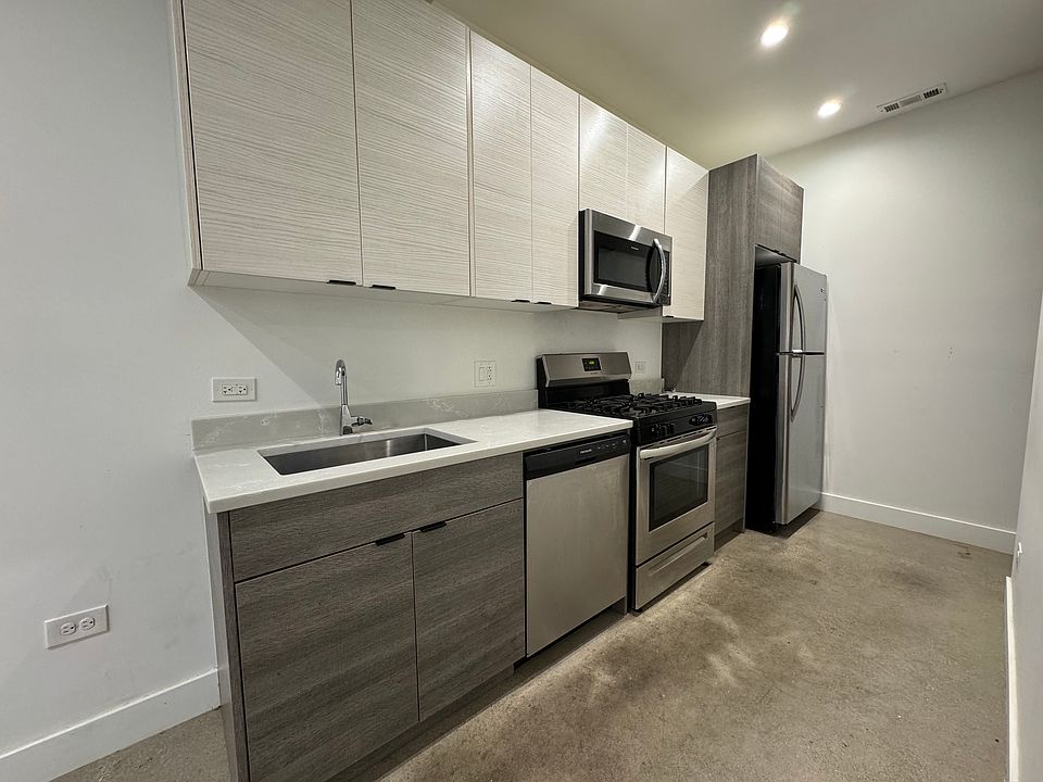 Massive studio with separate bedroom, living space and kitchen. Brand new kitchen and baths. High end cabinets. Quartz counters. Stainless appliances with dishwasher. In unit laundry. Custom bathroom. Exposed Brick. Lots of built in shelving. Huge bedroom closet. So much more! $65 app fee. $350 move in fee per person.