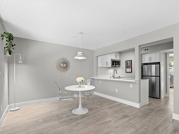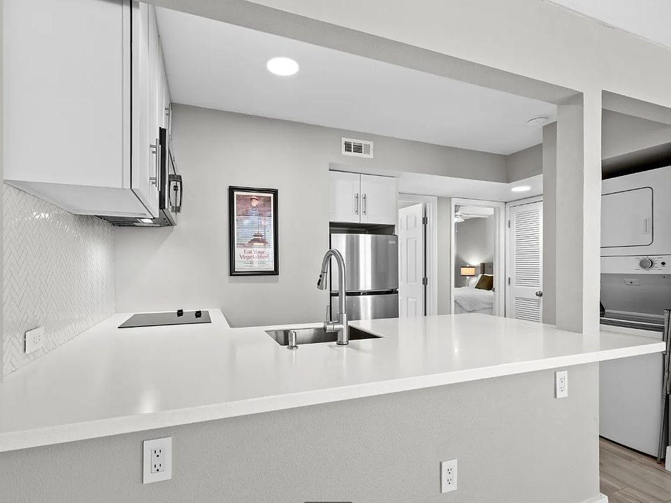 This Gated 2/1 completely remodeled first-floor condo is a 2-bedroom, 1-bath first-floor end-unit with new central air conditioning, hot water tank, and appliances. The kitchen has upgraded solid wood soft-closing white shaker-style cabinets, Quartz countertops, a breakfast bar, stainless appliances, new fixtures, and much more. The bathroom completely was redone, with a walk-in shower, a new solid wood vanity and cabinetry, solid-surface countertops, frame-less shower door, tile shower walls to the ceiling, and new plumbing. New light fixtures, ceiling fans, decor switches with dimmers and timers throughout the unit. A new Full-Size stack-able Washer/Dryer is included as well as curtains and window treatments. The Living Room and Dining Room Combo provide an open, spacious atmosphere that is still cozy and spacious. Gated Community, safe and secure, private parking included.