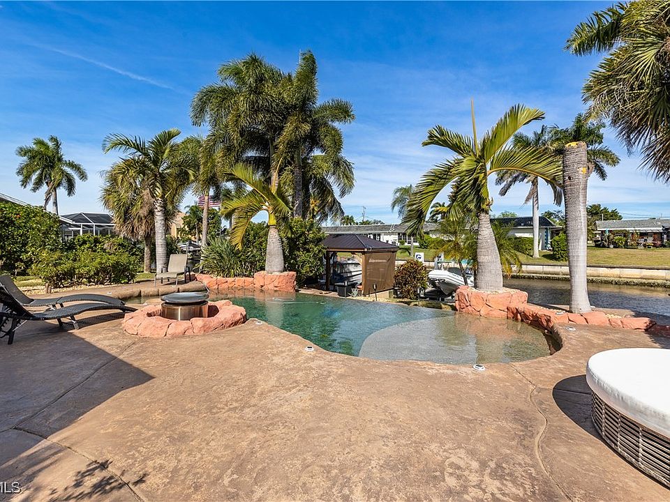 Boat liftResort-style poolSparkling poolTropical backyard oasisLush landscaping