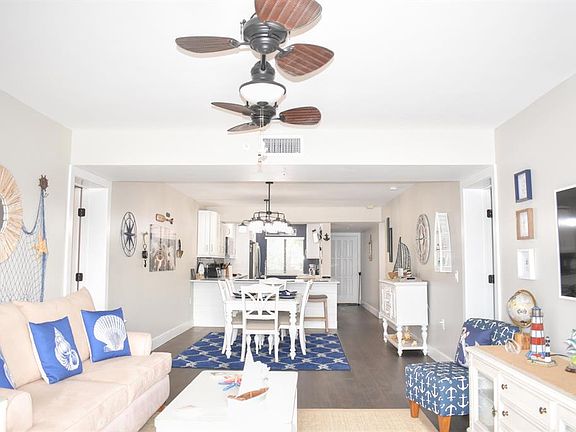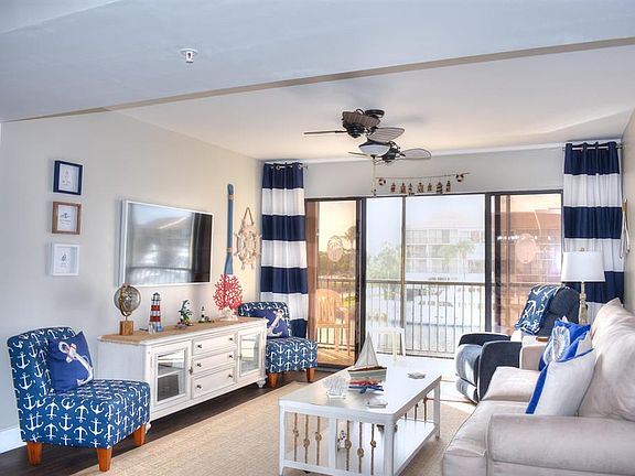 Available Now - May. Completely remodeled ! Waterfront view! Walk to beach! New expanded kitchen, new baths, shaker white cabinets with quartz countertops. All new coastal furnishings. Turn Key, Furnished. They've thought of everything you will need!