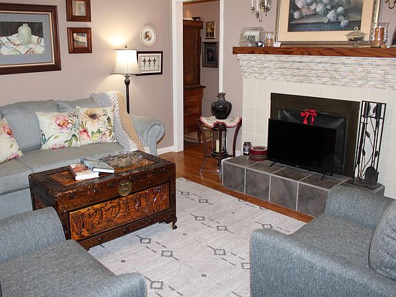 Double fireplaceTile fireplaceNew windowsFenced-in backyardHickory treeExposed stone wallBuilt-in china cabinet