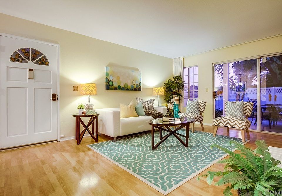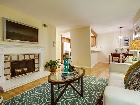 Enjoy year-round resort-style living with this super clean lower unit that features an unusually LARGE private patio/yard that has just been re-landscaped and is a great space to enjoy the wonderful So Cal climate. Views of the babbling brooks can be enjoyed from the bright dining area and the spa is just a few steps away from your front door. Spacious living area features a custom fireplace and sliding glass doors to access to the wonderful yard where you can sit and enjoy the soothing sounds of the running streams. Gleaming wood laminate floors run throughout the living & dining areas. Bright kitchen features natural wood cabinetry, white tile counters and appliances. Spacious master suite includes a full bath & walk-in closet with organizer. Secondary bedroom features built-in cabinetry with roll-out drawers and makes the perfect home office. Hall bath has been upgraded with custom tile and quartz countertop. Indoor laundry room with access to both bathrooms adds convenience. Super prime location offers easy access to street parking for your guests. Ponderosa Springs just recently underwent a $4.5 million exterior renovation and the grounds are once again beautifully landscaped and maintained. The pool and spa area will have you feeling like you're on vacation every day. It's a very walkable location with local shopping, dining and movie theaters only a few blocks away. Easy access to the freeway for commuters too. Parking spaces are #325 & #326.