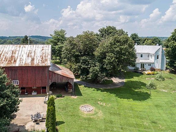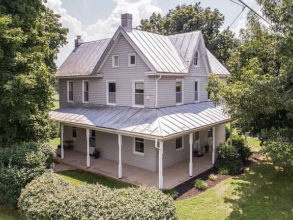 Original charm meets functional & fresh in this refurbished & updated farmhouse. Kitchen w/ granite & ss appliances. Family room w/ lovely brick hearth & wood stove. Main level bdrm & full bath. Dining rm w/ built-ins & tin ceiling. Upstairs laundry. Expansive outdoor patio perfect for entertaining. Bank barn w/ stables; 4 bay run-in shed & additional shed w/ electric. Variance allows for 2 horses