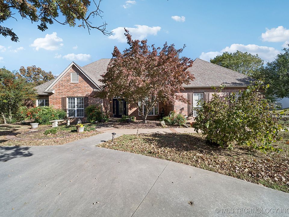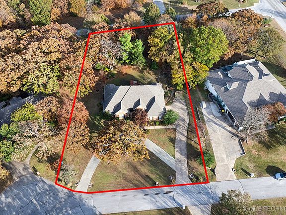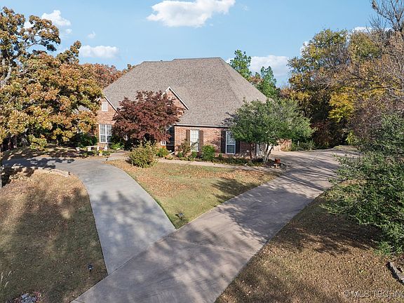 Beautiful 3-bedroom, 3-full-bath one-owner home in the Bixby School District. This property offers a circle drive and side-entry garage on a wooded lot that extends to 14th Circle. The formal living room features a vaulted ceiling and a wall of windows overlooking the private, wooded backyard. The 2017 remodeled kitchen includes quartz counters, island, den with fireplace, pantry and warm breakfast nook. All appliances remain. Hardwoods span the kitchen, hall, and entry, accented by crown moulding throughout. Tray ceilings highlight both the den and the primary bedroom. Additional updates include replacement carpet upstairs (2020), remodeled hall bath, custom window treatments and a whole-home vacuum system with kitchen baseboard sweep. Per appraiser, 919 finished square footage of the reported 3,434 square footage is located below grade in the walk out basement. Per appraiser, 717 square footage of unfinished space is located below grade in the walk out basement. (717 square footage is not included in reported square footage.) This space includes an amazing workshop with electrical and lighting along with an easily accessible mechanical closet. The partial walk-out basement adds versatility with a full bath, finished living room, office, unfinished mechanical room and workshop. Outdoors, enjoy the recirculating stream bed and pond fountain, along with established perennial gardens and mature landscaping. Priced with needed updates in mind, the property holds great potential for Buyers looking for single level living with bonus space on a large private lot. Call today!