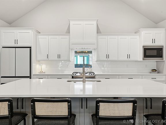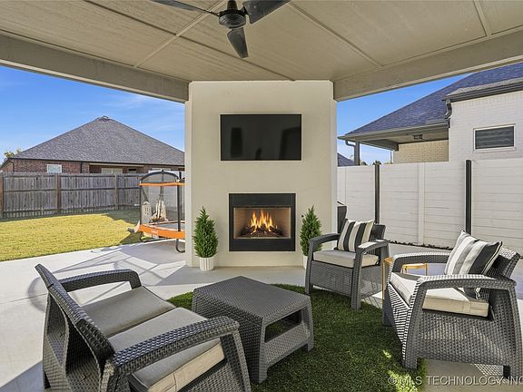 Outdoor fireplaceSophisticated spaceOpen-concept designSpacious livingWindow above the sinkShaded summer eveningsOversized pantry