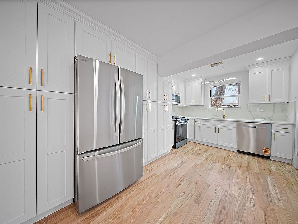 Open the door and enter an expansive sun drenched modern open concept living/dining area which provides great space for entertaining. The beautiful chefs granite kitchen is tucked away towards the rear of the property featuring floor to ceiling custom cabinetry, adorned with a full fleet of stainless steel appliances, and leads out into lush rear yard. Powder room on first floor for your guest.