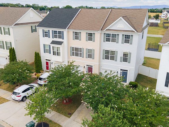 This beautifully maintained 3-story end unit townhome is ready for immediate occupancy. The large front trees, mature landscaping and privacy fenced yard provide ample separation from surrounding neighbors. The rear concrete patio is perfect for a firepit and relaxing with friends. Let the pets run as the entire rear and portion of the side yard is privacy fenced. Step through the front door and you're greeted by a bright and airy entry foyer with upgraded vinyl plank flooring, access to a large coat closet and views of the main level rec room. The rec room is carpeted, offers access to a half bath, and features a bump out addition with sliding glass doors to the rear patio and yard. The main level also features the homes laundry room, utility closet and one car garage. On the second level you'll find an open floor plan with spacious living room, dining area, equipped kitchen and sun room. The living room offers fresh paint, vinyl plank flooring, 9 ft ceilings, access to a half bath and is open to the kitchen and sun room. The kitchen includes upgraded amenities like granite counters, storage pantry, stainless steel appliances, recessed counter top lighting, center island and dark wood cabinets for a modern feel. The kitchen includes plenty of table space to seat 6 comfortably. The adjacent sun room offers additional layout options and furniture configurations. This room offers sliding glass doors to your future 2nd level deck. This main living floor flows wonderfully between all rooms and is a perfect floor plan for entertaining. The private 3rd level includes the primary suite and primary bath, along with 2 additional bedrooms and a hall bath. The primary suite includes a separate bump out that could be used for fitness equipment, a dressing area, private sitting area or home office. The primary suite also includes access to a large walk-in closet and deluxe full bath. The bath offers a double vanity, tile walk-in shower and corner sunken soaking tub with mountain views from the picture window. The home offers access to a bath on each level, includes 9 foot ceilings, crown molding, security system, natural gas cooking and heating, central air conditioning, large storage closets, and more. The homes location allows for walking access to the community park. I-81 & I-70 access is convenient to this home for daily commuters. Just across the street you'll find 24-hour amenities that include shopping, dining, fitness centers, and major employment centers.