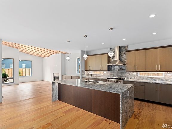 Contemporary new home by Ava Homes. High quality craftsmanship designed for modern living. Nestled in desirable Olympic Hills neighborhood, featuring classic NW design & materials. Open floor plan, custom metal railing, gourmet kitchen with slab quartz countertops and large kitchen island. 4BR, office & bonus rm, 2.75BA. Covered outdoor living w/ gas fireplace. Custom closet package. 2-car garage. Convenient to new Olympic Hills Elementary, Northgate Mall, and future Light Rail.
