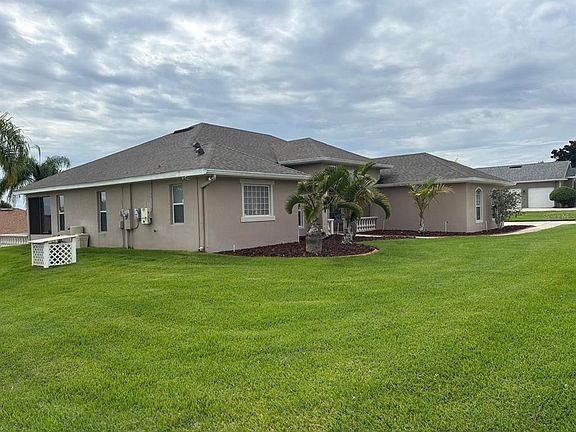 Welcome to this beautifully maintained corner lot home. This spacious property features 4 bedrooms, 3 baths, a cozy family room, a formal living and dining room and a dedicated office room perfect for remote work. Enjoy your evenings in serenity in your extended lanai (14x40) in addition to the screened in enclosed back porch. The house is equipped with Solar for energy efficiency in addition to a solar water heater. It has a well for the sprinkler system to keep the landscape lush together with a water softener for the house. A home generator is also included should the need arise in inclement weather. The large sliding glass doors leading from the master bedroom and living room have roll up shutters. The kitchen boasts all stainless-steel appliances like new with granite countertop. Elegant palm trees surround this almost half acre property with side entry garage. Automatic exterior landscape lights are installed front and back of this pristine home.