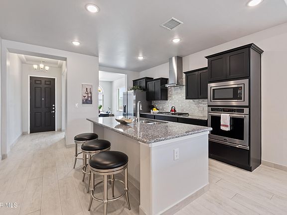Welcome to this gorgeous Spanish‑style, single‑story home built in 2020 by Hakes Brothers in coveted Peyton Estates. The open-concept layout spans approximately 1,657 sq ft, featuring 3 bedrooms and 2 full baths, ideal for both family living and entertaining. Step inside to discover a dramatic great room, highlighted by decorative ceiling beams and bathed in natural light. The adjacent gourmet kitchen is a chef's dream, complete with a large island, granite countertops, stainless-steel appliances, and recessed lighting. The master suite offers comfort and convenience with a spacious walk-in closet and an ensuite bathroom featuring dual vanities, a separate garden tub, and a stand-up shower. Guests will appreciate two additional well-sized bedrooms, each with easy access to the guest bath. Throughout the home, enjoy wood-look ceramic tile flooring, refrigerated A/C, and ceiling fans for year-round comfort. The exterior is low-maintenance stucco with a charming front landscaped area and a private backyard equipped with a covered patio and gas line hookup for grillingperfect for outdoor gatherings. Perfect for families or professionals seeking a stylish and functional space, this home pairs smart design with quality craftsmanship. Schedule your private tour today and fall in love with Tryne Way living!