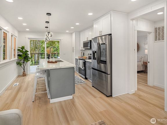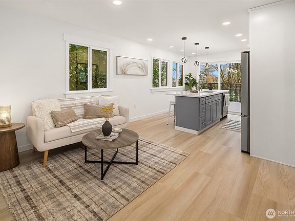 Nestled in Edmonds this fully updated 2-bed home offers modern style, just steps from Picnic Point Park. Open-concept layout boasts striking board-&-batten accent wall. Large windows let in natural light & highlight peekaboo views of Sound & Olympics. Kitchen offers spacious quartz island w/ seating, dual-tone shaker-style cabinetry, & a full suite of SS Samsung appliances. Enjoy yr-round comfort w/ mini-split heating & cooling. Thoughtfully designed laundry room w/ built-in desk maximizes functionality. Bathroom features heated floors. Spacious deck, perfect for entertaining or relaxing. NEW roof. Driveway parking for 2-cars. In the Mukilteo School District.