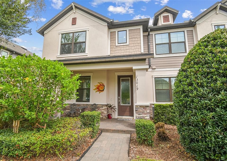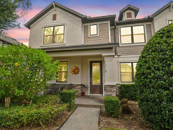 IMMACULATE/EXTERIOR MAINTENANCE FREE and move-in ready south facing townhome in sought-after Starkey Ranch in Odessa, FL, is now available. This STUNNING craftsman style 3 bedroom, plus flex/office space/ 2.5 bathroom, 2 car garage home is an END UNIT offering a view of water, beautiful landscaping and paver front porch. Once inside, take note of the show stopping 2-story entrance with BALCONY and gorgeous engineered hard-wood staircase. There is UVA security film on upstairs windows and front door to protect them should they be hit and also helps in maintaining a cooler temperature. Modern wood-like tile flooring throughout the main level. Upgraded 5 1/4 inch baseboards. Newer interior paint. Continuing through to your left you have the flex space with french doors perfect for an office, craft room, play room, or a 4th bedroom (no closet). Designer lighting lights up the foyer that leads you to the heart of the home. Laundry room is on main floor providing additional storage area. Washer and dryer included. 1/2 bath for convenience. The living room is light and bright and connects to the kitchen for easy entertaining/conversation. Unique shiplapped electric fireplace with mantel provides a cozy feel. Deluxe kitchen with stainless steel appliances, gas range, granite shiplapped island for additional seating, ample counter space with custom backplash and under cabinet lighting. 42 inch espresso cabinets with trim molding. Spacious pantry. Upstairs enjoy NO CARPET and the newer luxury vinyl flooring with counter round. On one side you have a large bedroom that is very quiet and private. Full bathroom- walk in shower- is shared with this room and the 2nd spacious room and has a tiled shower with listello details, a built-in wall niche, and granite sink. On the other end is the primary retreat with beautiful views and windows and lots of space. Ensuite bathroom provides walk-in shower with tile and listello details and built-in wall niche. Both bathrooms have custom mirrors. From the kitchen, open the side door to you outdoor oasis that is screened in. This is certainly an additional space to relax and unwind in. Off of the porch/lanai is the 2 car garage with epoxy flooring. This home is situated perfectly within the community nearing both entrances. The Starkey K8 school is close as well as grocery, restaurants, medical, and entertainment. Parking spaces along the front of the townhomes are there for convenience.